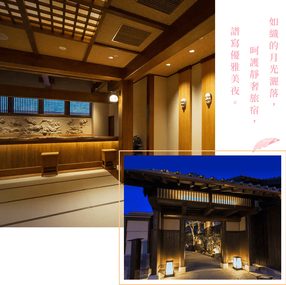 以「神話之鄉」為靈感的高雅御宿,以出雲神樂笛、神樂面具、神話浮雕及仿古寶劍等裝飾點綴。所有客房均設有露天天然溫泉,採溫潤木質和風裝潢,流露出雲獨有的莊重氛圍。