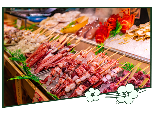 漁獲豐富的海鮮市場,也是當地居民的海洋廚房,一起覓尋當天捕撈的蝦貝、海膽、生魚片、鰻魚串等繁多海產,喚醒旅人對新鮮滋味的渴望。